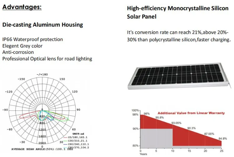 We use high-quality and high-performance LED as lighting sources, mostly from high-end brands with LM-80 testing reports and more than 160 LM/W luminous flux performance. For solar series, we use high-quality LiFePO4 batteries which can cycle more than 2500 times, and high-end monocrystalline silicon solar panels with conversion efficiency up to 23.4%.